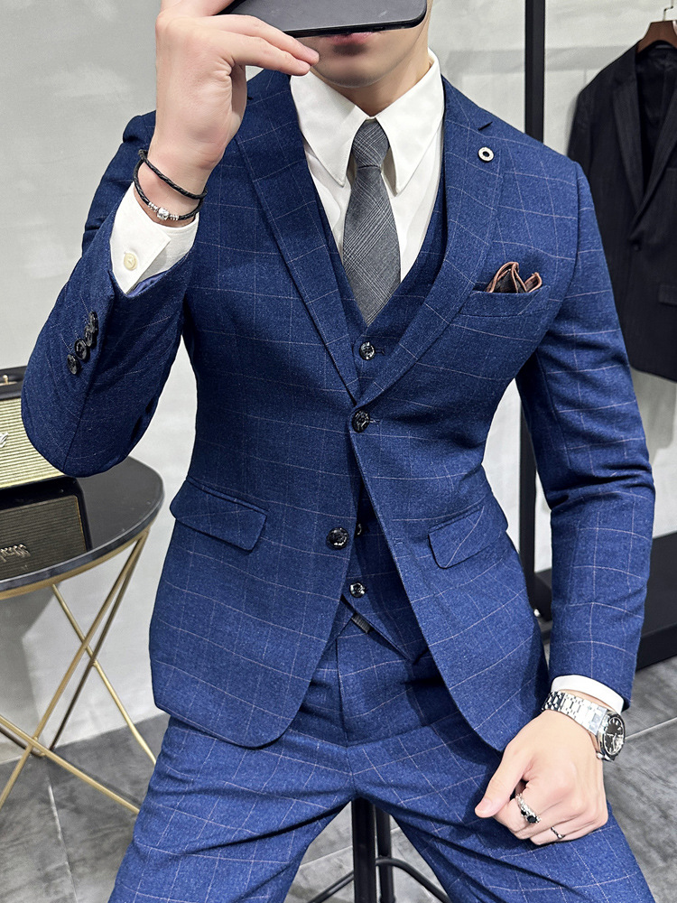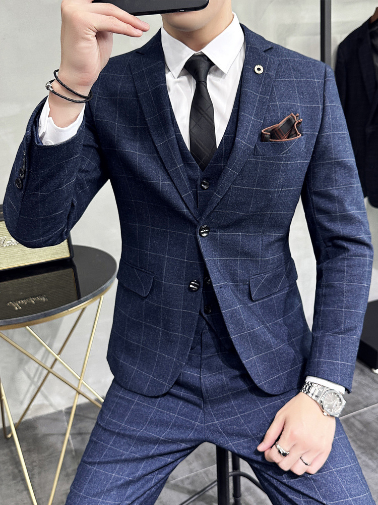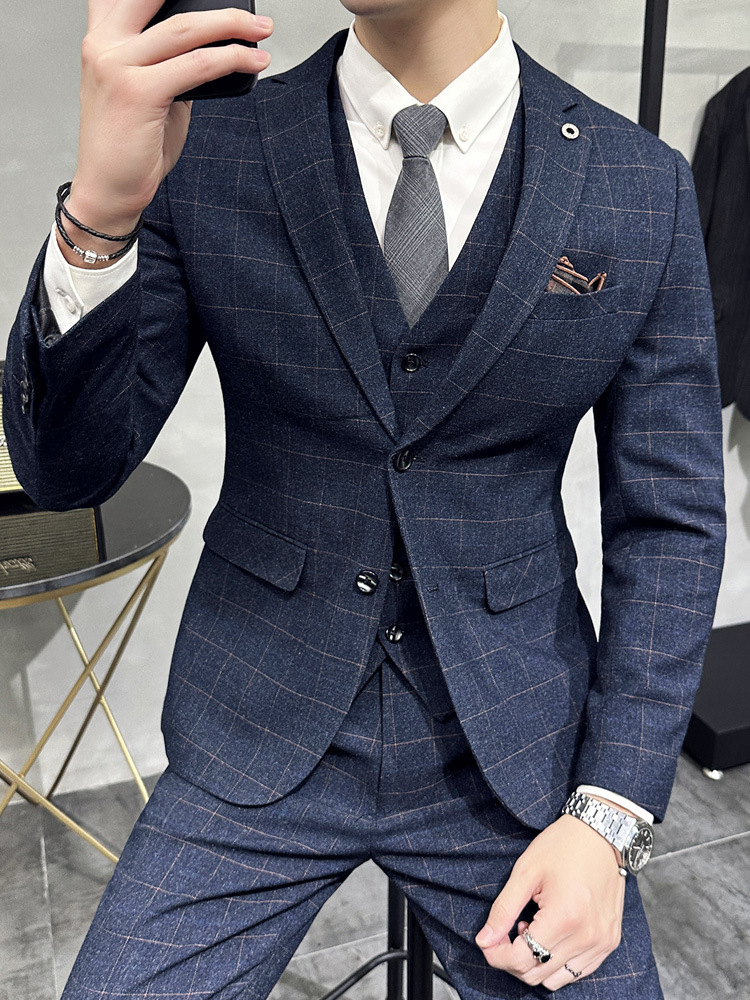 Men's three-piece casual formal slim wedding dress plaid suit men's British autumn